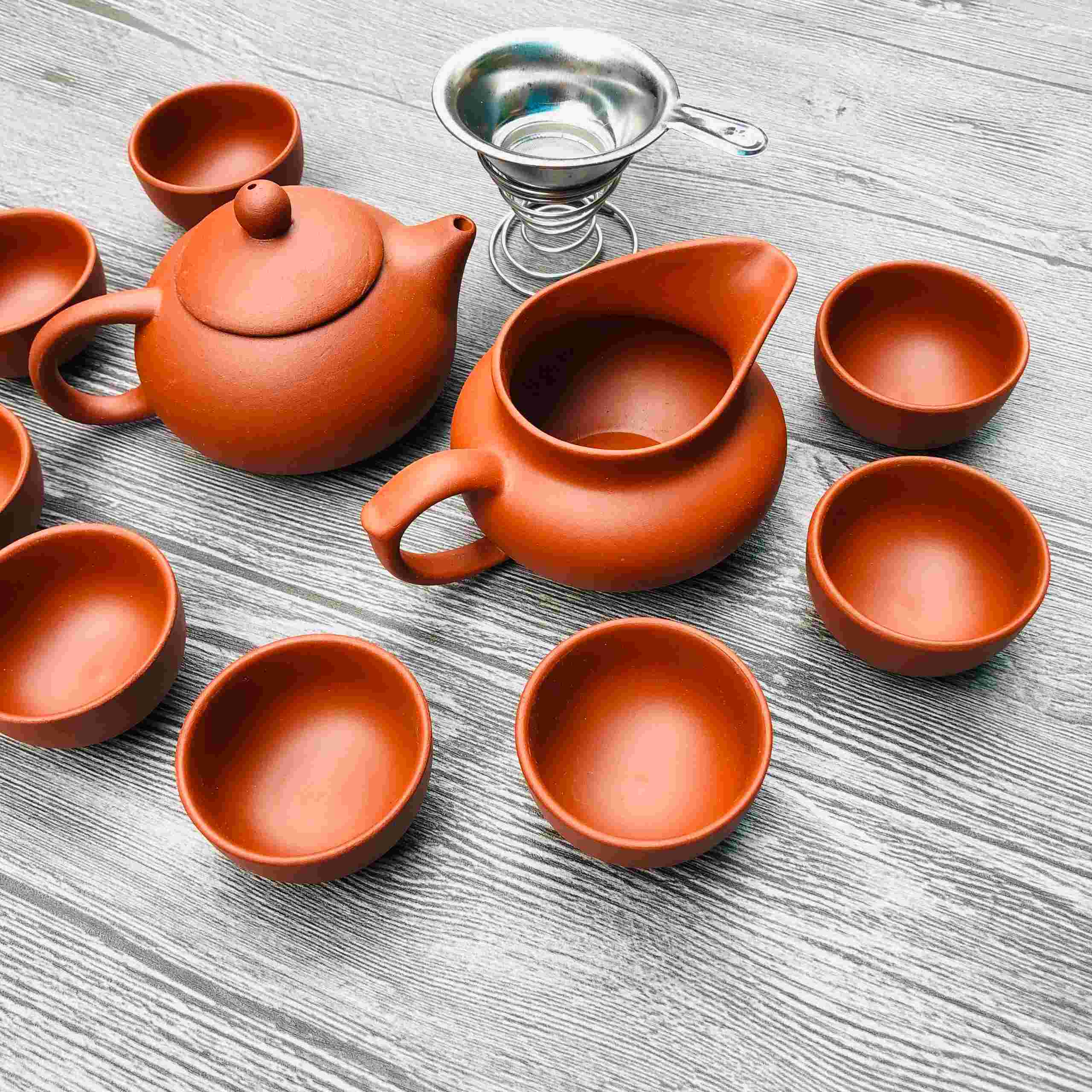Bộ tách trà sứ bọc đất nung được làm từ đất sét, một loại đất cao cấp nhất, được thiết kế tinh xảo và khéo léo. Bộ ấm có màu nâu đất, bao gồm 8 chén trà và 1 bình trà, 1 tách trà, 1 ấm công lý